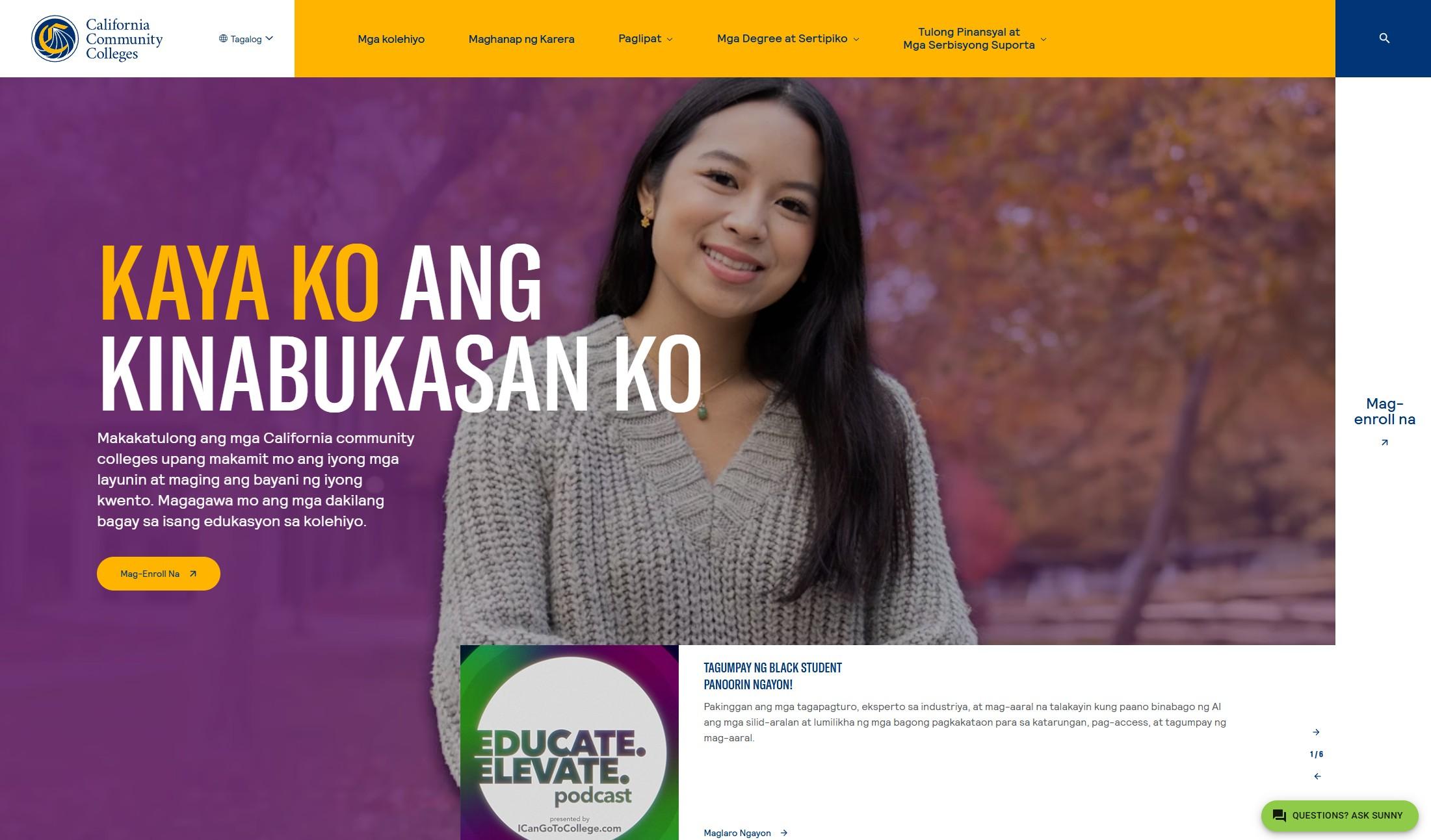 The California Community Colleges Chancellor’s Office is dedicated to celebrating the diversity woven throughout the state. By offering culturally relevant resources like the Tagalog I Can website, CCC strives to ensure all students can efficiently access higher education, helping them achieve their goals and positively impact the lives around them.